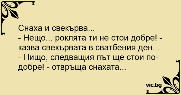 - Нищо, следващия път ще стои по-добре! - отвръща снахата...