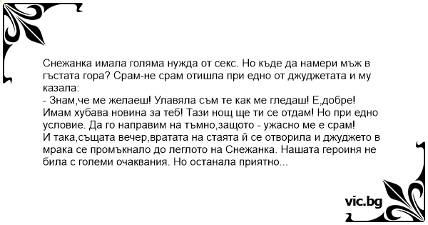 И така,същата вечер,вратата на стаята й се отворила и джуджето в мрака се промъкнало до леглото на Снежанка. Нашата героиня не била с големи очаквания. Но останала приятно изненадана! Започнало се едно буйно клатене,което продължило с часове! След седмия opгaзъm,Снежанка запалила цигара и простенала блажено: