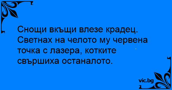 Снощи вкъщи влезе крадец. Светнах на челото му червена точка с лазера, котките свършиха останалото.