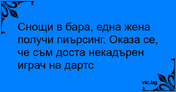 Снощи в бара, една жена получи пиърсинг. Оказа се, че съм доста некадърен играч на дартс