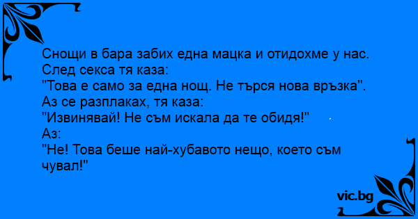 Снощи в бара забих една мацка и отидохме у нас. След cekca тя каза: