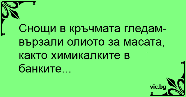 Снощи в кръчмата гледам- вързали олиото за масата, както химикалките в банките...