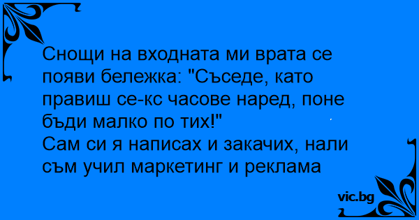 Снощи на входната ми врата се появи бележка: "Съседе, като правиш cekc часове наред, поне бъди малко по тих!"
