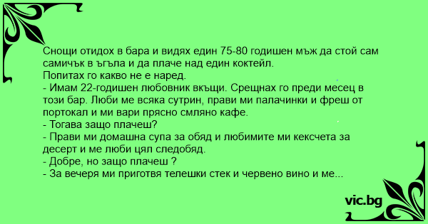 - Имам 22-годишен любовник вкъщи. Срещнах го преди месец в този бар. Люби ме всяка сутрин, прави ми палачинки и фреш от портокал и ми вари прясно смляно кафе.