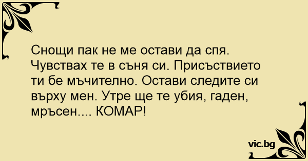 Снощи пак не ме остави да спя. Чувствах те в съня си. Присъствието ти бе мъчително. Остави следите си върху мен. Утре ще те убия, гаден, мръсен.... КОМАР!
