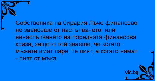 Собственика на бирария Лъчо финансово не зависеше от настъпването или ненастъпването на поредната финансова криза, защото той знаеше, че когато мъжете имат пари, те пият, а когато нямат - пият от мъка.