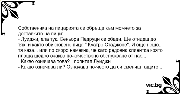 - Луиджи, ела тук. Сеньора Педруци се обади. Ще отидеш до тях, и както обикновено пица " Куатро Стаджоне". И още нещо.. тя каза... или по-скоро намекна, че като редовна клиентка която плаща щедро очаква по-качествено обслужване от нас...