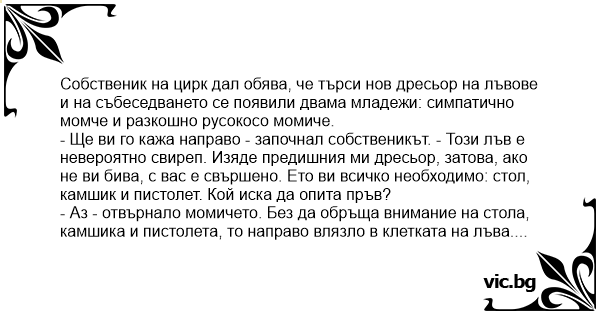 - Ще ви го кажа направо - започнал собственикът. - Този лъв е невероятно свиреп. Изяде предишния ми дресьор, затова, ако не ви бива, с вас е свършено. Ето ви всичко необходимо: стол, камшик и пистолет. Кой иска да опита пръв?