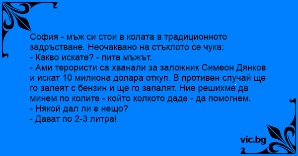 Шофьор на камион стои в задръстване. O motorista está preso em um engarrafamento na avenida que passa ao lado do Congresso Nacional em Brasília. Nenhum carro se movimentava. De repente, um homem bate em sua janela. O motorista abre o vidro e pergunta: Σ' έναν αυτοκινητόδρομο της Καλιφόρνια, κάποιος οδηγός φτάνει σ';ένα τεράστιο μποτιλιάρισμα και σταματάει. Κάποιος τον πλησιάζει και του χτυπά το τζάμι. Ein Autofahrer ist auf der Autobahn in einem Stau steckengeblieben. Plötzlich klopft jemand an das Seitenfenster. Er lässt die Scheibe herunter und fragt: "Was ist los?" Darauf der Passant mit ernster und erregter Stimme: "Terroristen haben die österreichische Fußball- Nationalmannschaft... In den USA ist ein Autofahrer auf dem Highway in einem Stau stecken geblieben. Stehende Kolonne. Plötzlich klopft jemand an das Seitenfenster. Er lässt die Scheibe herunter und fragt: "Was ist los ?" "Terroristen haben Präsident Bush entführt. Sie verlangen 10 Mio Dollar Lösegeld, sonst werden... En un país golpeado por la corrupción de sus políticos, un turista encuentra un tumulto en la calle y pregunta: - Disculpe, que ha pasado? - Han secuestrado el Presidente -¿Y ahora? - Pues los secuestradores están pidiendo un rescate de tres millones de dólares, de lo contrario quemarán al... En bilist sitter i bilkö på motorvägen. Trafiken står helt still. Plötsligt knackar en man på sidorutan. Föraren vevar ner fönstret och frågar: - Vad har hänt? - Folket har tagit Löfven och... На світлофорі стоять автомобілі. До одного з них підходить чоловік і каже: — Вибачте що турбую, але терористи захопили нашого депутата і вимагають 10 мільйонів викупу, інакше вони погрожують його... En man satt fast i mitten av en enorm bilkö på en motorväg. Kön hade inte rört sig på över en halvtimme och han började bli riktigt irriterad. Plötsligt fick han se en pojke på en skateboard som... Terwijl ik vanmorgen in mijn auto geduldig voor het stoplicht wachtte, kwam er een man met een oranje voetbalpetje naar mijn auto toegelopen. Hij klopte op mijn raam en wenkte mij dat hij me iets... Terwijl ik vanmorgen in mijn auto voor het stoplicht wachtte, kwam er een man met een oranje voetbalpetje naar mijn auto toegelopen. Hij klopte op mijn raampje en ik draaide hem open. “Heeft u het... Bir gün adamın biri normal bir günde her zamanki gibi işine gidiyormuş. Sonra arabasına binmiş ve ışıkların orada çok fena trafik oluşmuş. Ama nasıl bir trafik!!! Hiç ilerlemiyor. Kaldırımdan geçen...