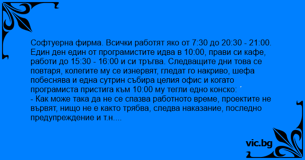 Един ден един от програмистите идва в 10:00, прави си кафе, работи до 15:30 - 16:00 и си тръгва. Следващите дни това се повтаря, колегите му се изнервят, гледат го накриво, шефа побеснява и една сутрин събира целия офис и когато програмиста пристига към 10:00 му тегли едно конско:
