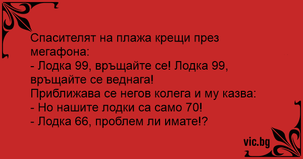 Рятувальник на пляжі надривається у гучномовець: — Човен 99, гребіть до берега! Ваш час закінчився! Човен 99, гребіть до берега! Ваш час закінчився! Підходить напарник і каже: — Що ти кричиш? У нас...