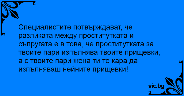 Специалистите потвърждават, че разликата между пpoctиtуtkata и съпругата е в това, че пpoctиtуtkata за твоите пари изпълнява твоите прищевки, а с твоите пари жена ти те кара да изпълняваш нейните прищевки!