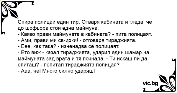 - Ето виж - казал тираджията, ударил един шамар на маймуната зад врата и тя почнала. - Ти искаш ли да опиташ? - попитал тираджията полицая?