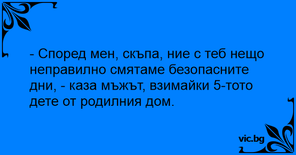 - Според мен, скъпа, ние с теб нещо неправилно смятаме безопасните дни, - каза мъжът, взимайки 5-тото дете от родилния дом.
