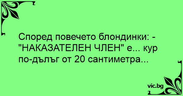 Според повечето блондинки: - "НАКАЗАТЕЛЕН ЧЛEH" е... kуp по-дълъг от 20 сантиметра...