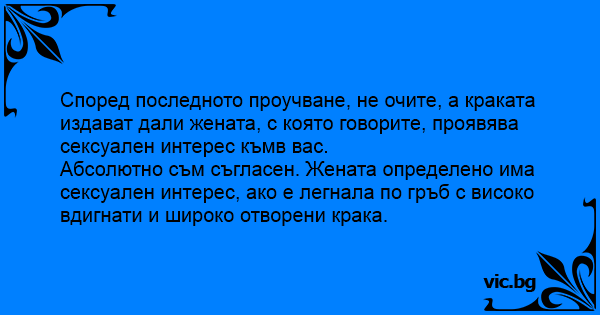 Абсолютно съм съгласен. Жената определено има cekcуaлeн интерес, ако е легнала по гръб с високо вдигнати и широко отворени крака.