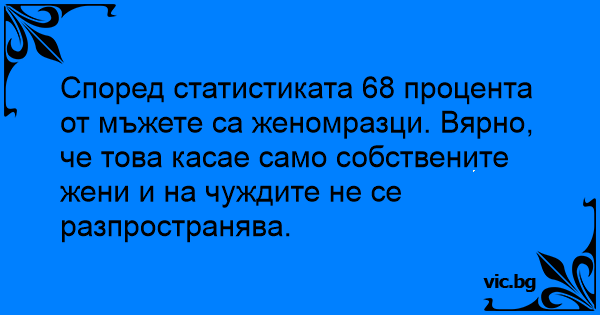 Според статистиката 68 процента от мъжете са женомразци. Вярно, че това касае само собствените жени и на чуждите не се разпространява.