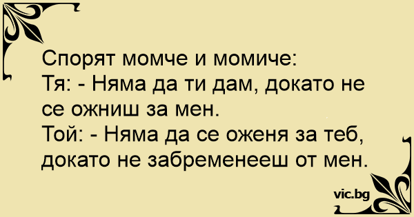 Той: - Няма да се оженя за теб, докато не забременееш от мен.