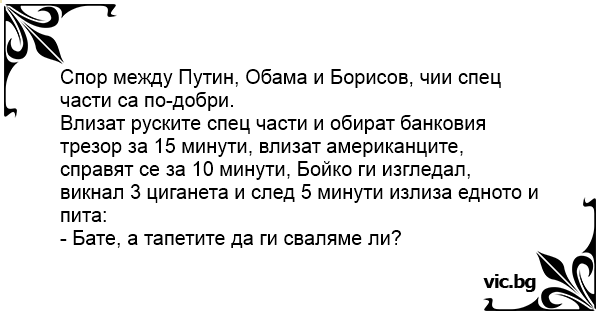 Влизат руските спец части и обират банковия трезор за 15 минути, влизат американците, справят се за 10 минути, Бойко ги изгледал, викнал 3 циганета и след 5 минути излиза едното и пита: