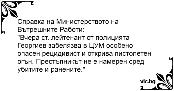 "Вчера ст. лейтенант от полицията Георгиев забелязва в ЦУМ особено опасен рецидивист и открива пистолетен огън. Престъпникът не е намерен сред убитите и ранените."