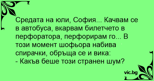 Средата на юли, София... Качвам се в автобуса, вкарвам билетчето в перфоратора, перфорирам го... В този момент шофьора набива спирачки, обръща се и вика: