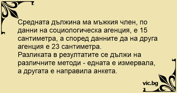 Средната дължина ма мъжкия члeн, по данни на социологическа агенция, е 15 сантиметра, а според данните да на друга агенция е 23 сантиметра.