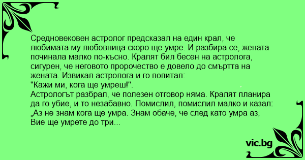 Средновековен астролог предсказал на един крал, че любимата му любовница скоро ще умре. И разбира се, жената починала малко по-късно. Кралят бил бесен на астролога, сигурен, че неговото пророчество е довело до смъртта на жената. Извикал астролога и го попитал: