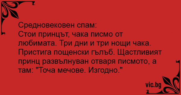 Прикинь  средневековый спам... в 15 веке стоит принц ждет письма от любимой.. три дня и три ночи ждет.. прилетает почтовый голубь.. Принц соответственно счастливый быстренько пытается прочесть присланное а там "кую мечи.. недорого"