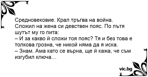 Средновековие. Крал тръгва на война. Сложил на жена си девствен пояс. По пътя шутът му го пита: