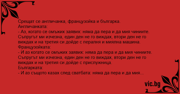 - И аз същото казах след сватбата: няма да пера и да мия чиниите. Съпруга ми изчезна, един ден не го виждах, втори ден не го виждах и на третия прогледнах с лявото око.
