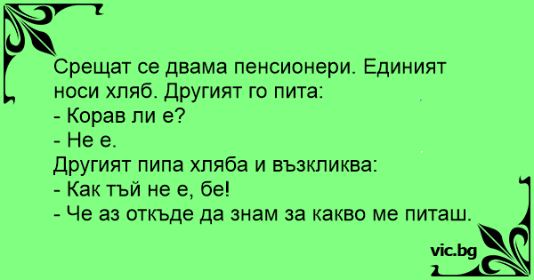 Срещат се двама пенсионери. Единият носи хляб. Другият го пита: