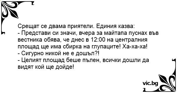 - Представи си значи, вчера за майтапа пуснах във вестника обява, че днес в 12:00 на централния площад ще има сбирка на глупаците! Ха-ха-ха!