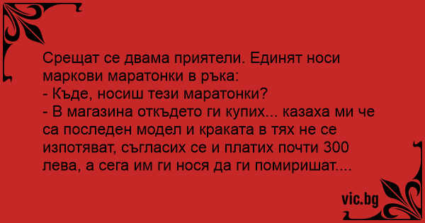 Срещат се двама приятели. Единят носи маркови маратонки в ръка: