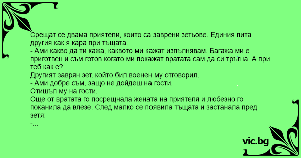 Срещат се двама приятели, които са заврени зетьове. Единия пита другия как я кара при тъщата.