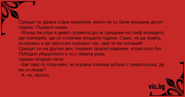 - Искаш ли утре в девет сутринта да се срещнем на голф игрището, ще поиграем, ще си спомним младите години. Само, че да знаеш, възможно е да закъснея половин час, ама ти ме почакай!