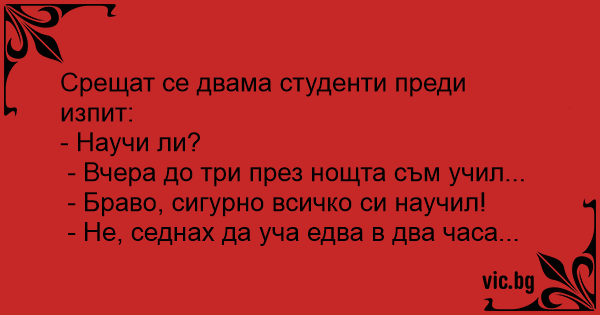 Срещат се двама студенти преди изпит: