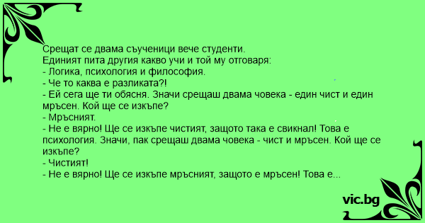 Срещат се двама съученици вече студенти. Единият пита другия какво учи и той му отговаря: - Логика, психология и философия. - Че то каква е разликата?! - Ей сега ще ти обясня. Значи срещаш двама човека - един чист и един мръсен. Кой ще се изкъпе? - Мръсният. - Не е вярно! Ще се изкъпе чистият, защото така е свикнал! Това е психология. Значи, пак срещаш двама човека - чист и мръсен. Кой ще се изкъпе? - Чистият! - Не е вярно! Ще се изкъпе мръсният, защото е мръсен! Това е логика. Значи, пак срещаш двама човека - чист и мръсен. Кой ще се изкъпе? - Че ... ли му майката!!! - А! Ето това е вече философия!