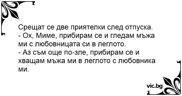 - Аз съм още по-зле, прибирам се и хващам мъжа ми в леглото с любовника ми.