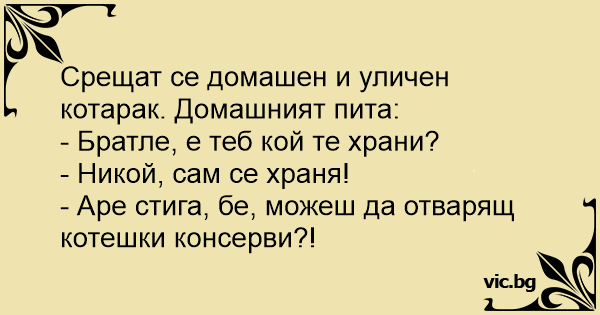 Срещат се домашен и уличен котарак. Домашният пита: