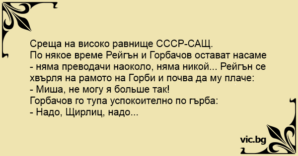 По някое време Рейгън и Горбачов остават насаме - няма преводачи наоколо, няма никой... Рейгън се хвърля на рамото на Горби и почва да му плаче: