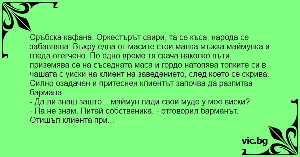 - Кажи друже, знаеш ли защо маймун лади свои муде у мое виски?