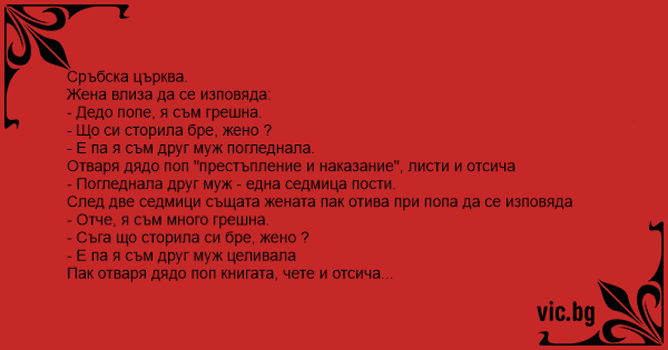 Отваря дядо поп "Престъпление наказание" , търси къде е това "джваканье на kуpeц", ама не може да го намери. Изпаднал в затруднение пита колегата си - поп в същата църква: