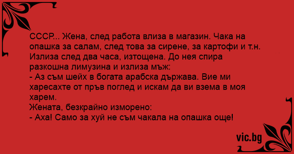 СССР... Жена, след работа влиза в магазин. Чака на опашка за салам, след това за сирене, за картофи и т.н. Излиза след два часа, изтощена. До нея спира разкошна лимузина и излиза мъж: