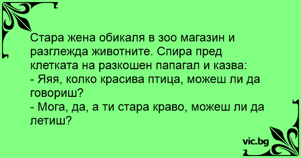 Стара жена обикаля в зоо магазин и разглежда животните. Спира пред клетката на разкошен папагал и казва: