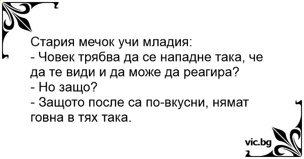 Стария мечок учи младия: - Човек трябва да се нападне така, че да те види и да може да реагира? - Но защо? - Защото после са по-вкусни, нямат говна в тях така.
