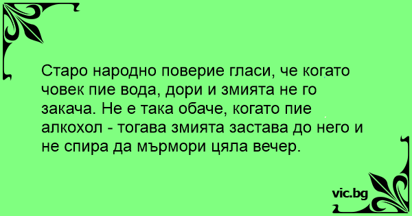 Старо народно поверие гласи, че когато човек пие вода, дори и змията не го закача. Не е така обаче, когато пие алкохол - тогава змията застава до него и не спира да мърмори цяла вечер.