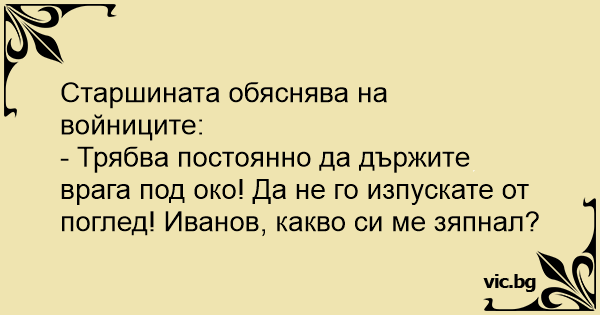- Трябва постоянно да държите врага под око! Да не го изпускате от поглед! Иванов, какво си ме зяпнал?