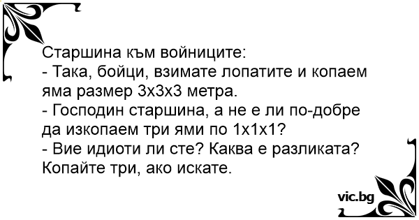 - Господин старшина, а не е ли по-добре да изкопаем три ями по 1х1х1?