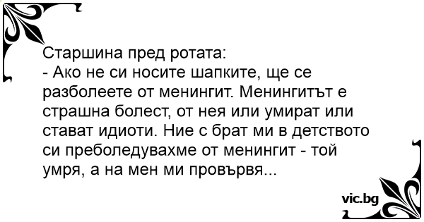 - Ако не си носите шапките, ще се разболеете от менингит. Менингитът е страшна болест, от нея или умират или стават идиоти. Ние с брат ми в детството си преболедувахме от менингит - той умря, а на мен ми провървя...