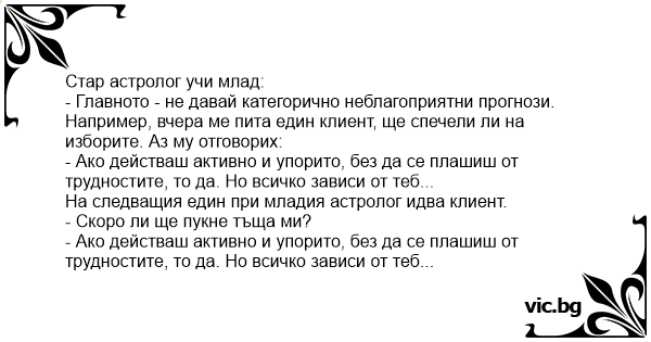 - Главното - не давай категорично неблагоприятни прогнози. Например, вчера ме пита един клиент, ще спечели ли на изборите. Аз му отговорих: